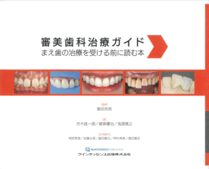 今年の2月にクインテッセンス出版株式会社様から、審美歯科治療ガイドという本を発売いたしました。この本は、3つの章から構成されており、1つ目は前歯の悩み(すきっ歯、欠けた、変色、矮小歯、抜けた、ガミー)別に、それぞれの治療法の特徴や流れなどを症例をもとにわかりやすく解説しています。また2では、前歯を治す上で重要な歯の形や色、表面性状などの特徴を解説し、3では、前歯に使用する材料(セラミック)の種類を解説しています。前歯の治療でお悩みの方には手に取っていただくべき内容となっております。この度は貴重な機会をいただいた、クインテッセンス出版の方々ありがとうございました。